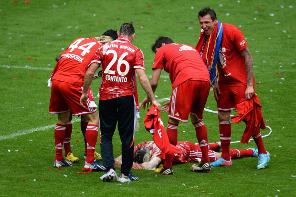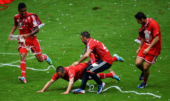 Bundesliigan voittoa kotikentällään juhlinut Bayern riehakoi kentällä ja kaatoi toistensa päälle olutta. Hauska tilanne nähtiin, kun Ribery yritti päästä karkuun Boatengia, joka kuitenkin onnistui lopulta monien muiden joukkuetovereiden tapaan kastelemaan Riberyn alkoholilla.
