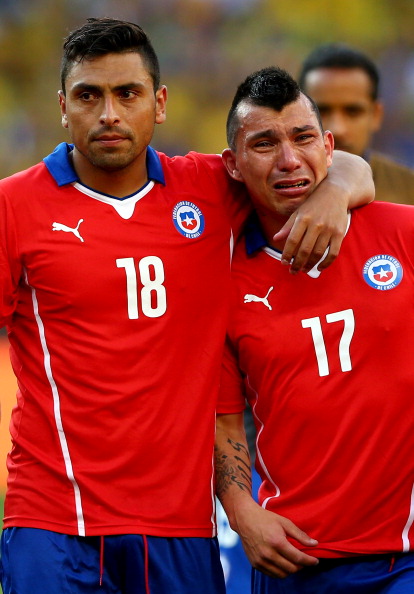Gary Medelin (oik.) pettymys purkautui kyyneliin. Lohduttajana ratkaisevan pilkun ampunut Gonzalo Jara.