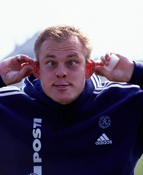 Paatelainen pelleilee kameran edessä vuona 1999 ennen maajoukkueen Saksa-peliä vieraskentällä.
