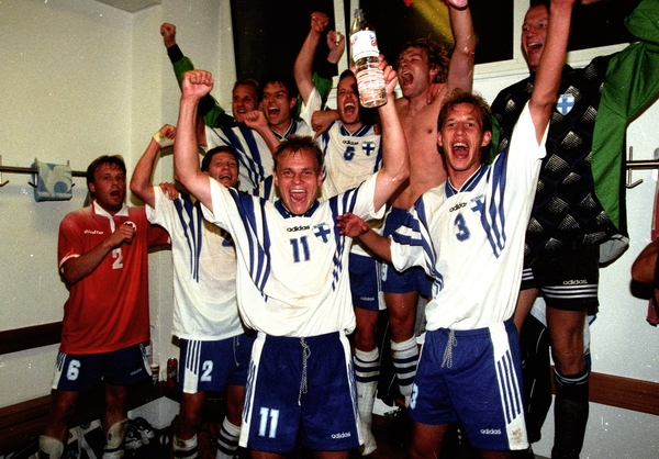 Paatelainen (kesk.) juhlii Huuhkajien kanssa voittoa Sveitsistä syksyllä 1997.