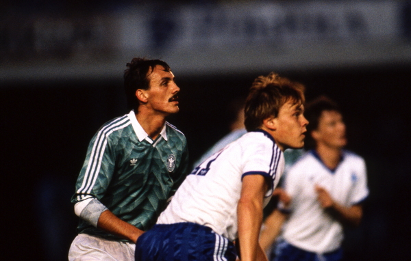 Tässä kuvassa mies kamppailee Länsi-Saksan pelaajaa Jürgen Kohleria vastaan MM-karsintapelissä vuonna 1988.