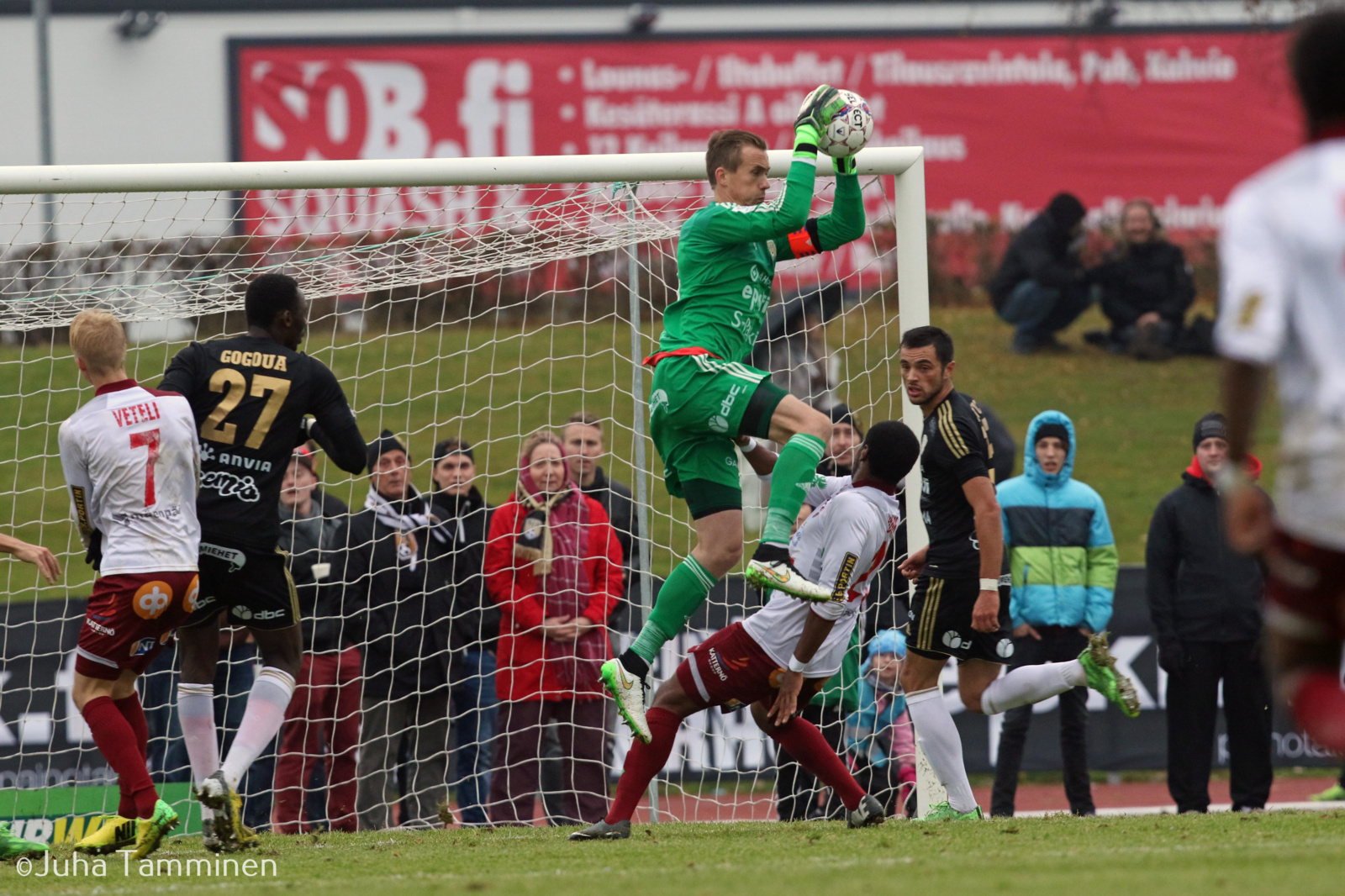 Kauden paras maalivahti Mihkel Aksalu oli ensimmäisten joukossa nostelemassa pokaalia.