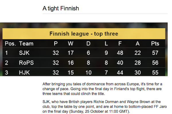 Veikkausliigan avoin mestaruustaisto on herättänyt kansainvälistä kiinnostusta. BBC Sport uutisoi verkkosivujensa kansainvälisessä katsauksessaan sanaleikillä ”A Tight Finnish” viitaten tiukkaan lopetukseen (finish).