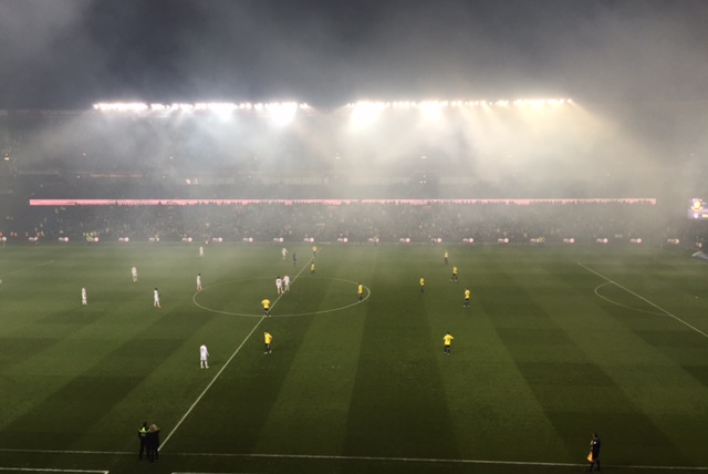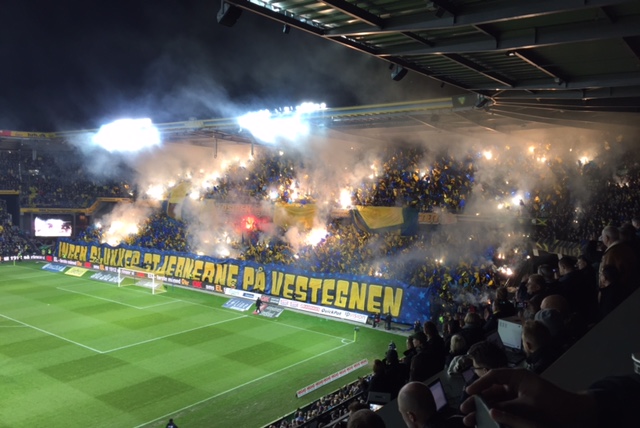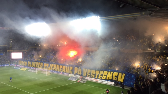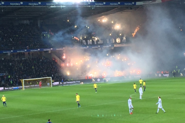 Sunnuntain derby ei tehnyt poikkeusta: Teemu Pukin edustaman Bröndbyn kotifanit panivat parastaan niin äänen, valon, liekkien kuin savujen suhteen. Eivätkä ”vierasjoukkue” FC Kööpenhaminan fanit jääneet juuri heikommiksi.