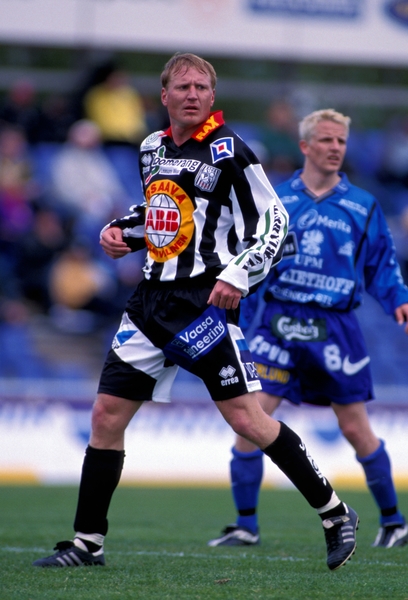 Kuvassa Tarkkio laukoo pallon kohti Porin Pallo-Tovereiden maalia heinäkuussa 1990 Pasi Sulosen estelyistä huolimatta.