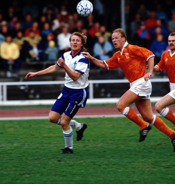 Kuvassa mies kamppailee silloisen hollantilaistähden, nykyisen Valioliiga-managerin Ronald Koemanin kanssa kesällä 1990 Olympiastadionilla.