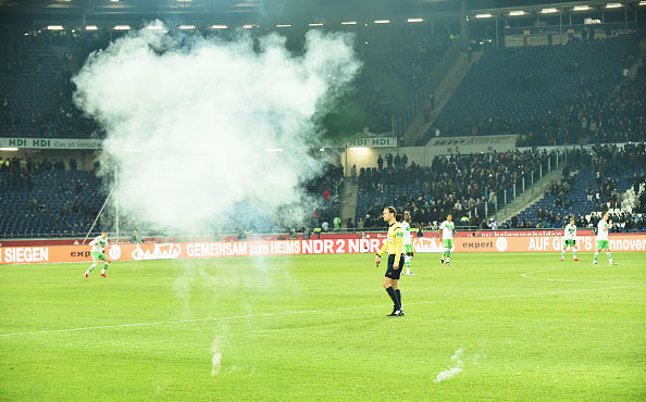 Yksi yli 2000-asteen lämpötilassa palavista soihduista lensi kotijoukkueen katetun vaihtopenkin sisään, mutta vahingoilta onneksi vältyttiin. Penkillä olivat tuolloin Hannoverin varavahti ja pari valmennustiimin taustajäsentä.
