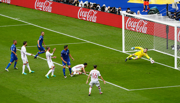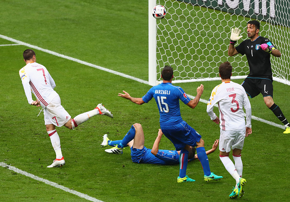 Giorgio Chiellini vei Italian johtoon 33. minuutilla. Italialaistoppari pääsi laittamaan pallon tyhjään verkkoon David de Gean torjuttua Ederin vapaapotkun eteensä.