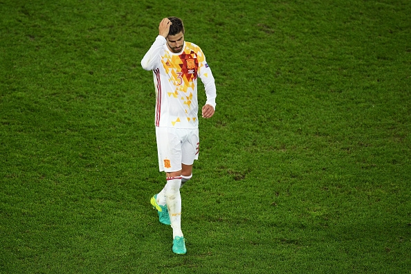 Espanjan maajoukkueen Gerard Piquen sormien venyttelystä nousi kohu, sillä jotkut tulkitsivat Piquen näyttäneen keskikormea kansallishymnin aikana tiistaina (kuva).
