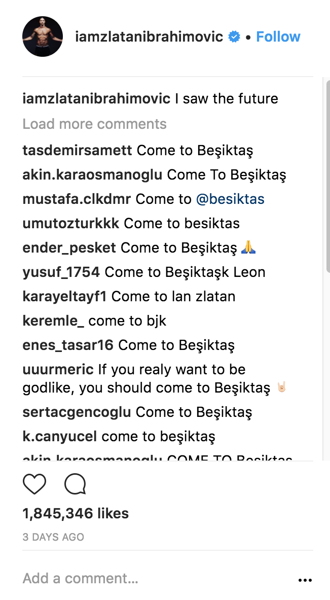 36-vuotias hyökkääjä julkaisi Instagramissa kuvan viime viikonloppuna. Turkista kantautuneiden uutisten jälkeen Besiktasin kannattajat ovat aloittaneet oman kampanjointinsa. Fanit ovat yksitellen kirjoittaneet kuvan kommenttikenttään toivovansa Ibrahimovićin siirtyvän Besiktasiin.