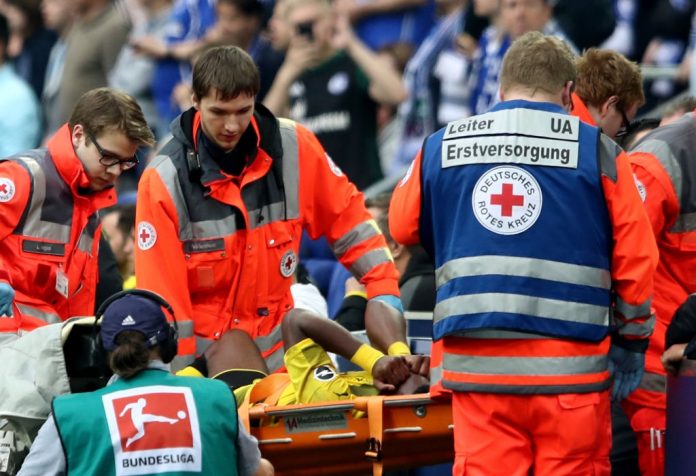 Dortmundin hyökkääjä Batshuayi loukkasi jalkansa ottelussa. Hänet kannettiin paareilla kentältä pois.