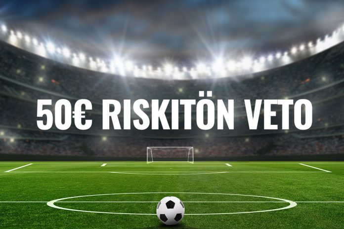 Voit lyödä riskittömän 50€ tarjouksen minkä tahansa joukkueen puolesta. Jos ensimmäinen vetosi ei voita, saat panoksen takaisin 50€ asti. Muista lunastaa tarjous ennen kierroksen alkua.Tästä ei tarjous enää parane!