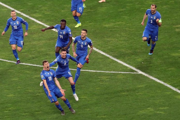 Kotijoukkue Azzurri siirtyi johtoon jo seitsemännellä minuutilla. Italia sai vapaapotkun noin 30 metristä vasemmalta puolelta. Pallo keskitettiin maalille, mutta Huuhkajien kippari Tim Sparv pääsi päineen väliin. Purkupallo tuli kuitenkin otollisesti vapaapotkun hankkineelle Nicolò Barellalle, joka latasi lujaa vastapalloon, ja peliväline kimposi Suomen puolustuksesta sisään. (Katso maali Viafreesta)