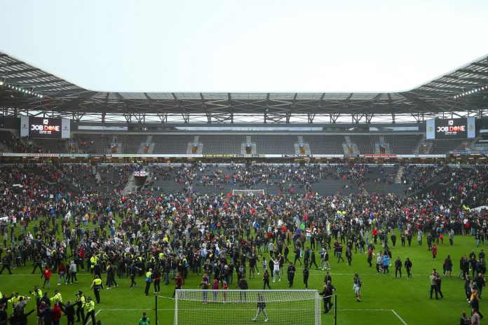 Kun nousujuhlien ensihuuma oli ohi, kokoontuivat pelaajat ja kannattajat vielä yhteiseen hetkeen kentän päätyrajan tuntumaan. Sitten alkoi uljas yhteislaulu. Ensin volyymi oli matalalla, mutta pikkuhiljaa desibelit nousivat ja niin pelaajat kuin fanitkin yltyivät hurjaan pomppimiseen. Ilmassa vaikutti olevan pelkkää onnea ja hurmosta, eikä merkkiäkään mistään uhkaavasta.