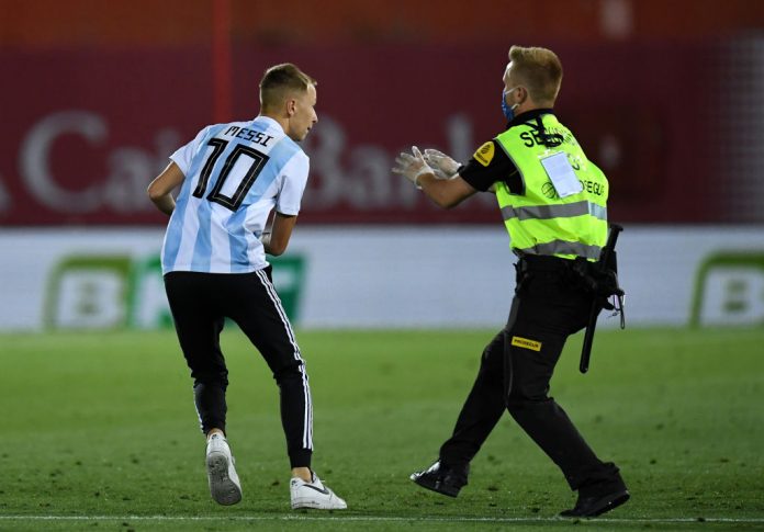 Argentiinan maajoukkueen paitaan sonnustautunut ja puhelinta kädessään pitänyt fani käveli rauhallisesti kentälle toisen puoliajan alussa. Hän lähestyi ensin Barcelonan puolustajaa Jordi Albaa ennen kuin hän suuntasi kohti Messiä.