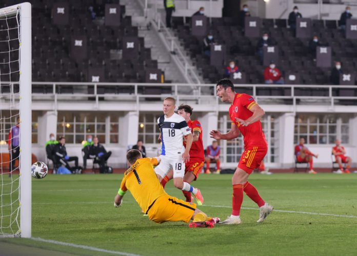 Lopulta Wales rokotti. Suomen puolustuksen oikealle laidalle syntyi valtava tila, johon pallo pelattiin Daniel Jamesille juoksuun. James pelasi kovan ja matalan pallon maalille, josta Moore ohjasi pallon Hradeckyn käsien kautta maaliin. Niskasen ja Väisäsen merkkaaminen epäonnistui ja Davies onnistui antamaan täydellisen syötön auenneeseen tilaan.
