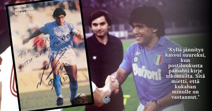 Kysyimme Suomen suurimmassa jalkapalloaiheisessa Facebook-ryhmässä, Jalkapallon olohuoneessa, muistoja Maradonasta poismenon yhteydessä. Hyttinen kommentoi suru-uutisen vieneen muistot nuoruuteen ja lapsuuteen. Kommentin mukana oli kuva (ks. alempaa) postikortista, jossa komeili itse Maradona. Kortti oli omistettu Terolle, ja mukana oli supertähden nimikirjoitus. Tuon kortin tarina oli syytä selvittää tarkemmin.