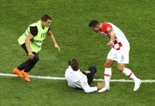 Kroatian toppari Dejan Lovren reagoi rajusti, kun häiriköt juoksivat kentälle eilisessä MM-finaalissa.