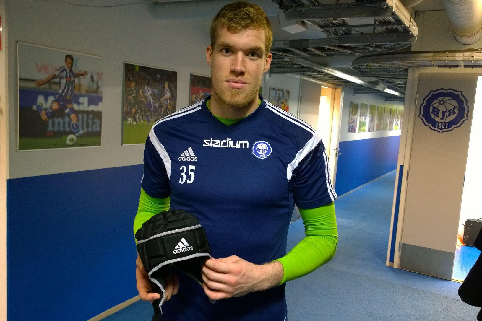 HJK-veskari Saku-Pekka Sahlgren vartioi maaliaan sunnuntaina FC Lahtea vastaan musta kypärä päässä.